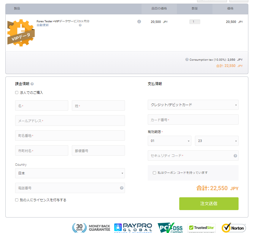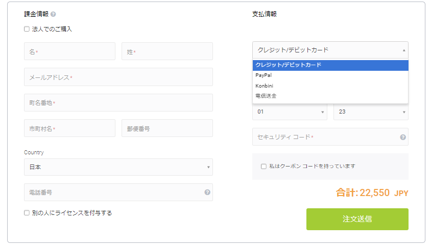 支払い情報を入力して注文送信ボタンを押せば購入完了です。