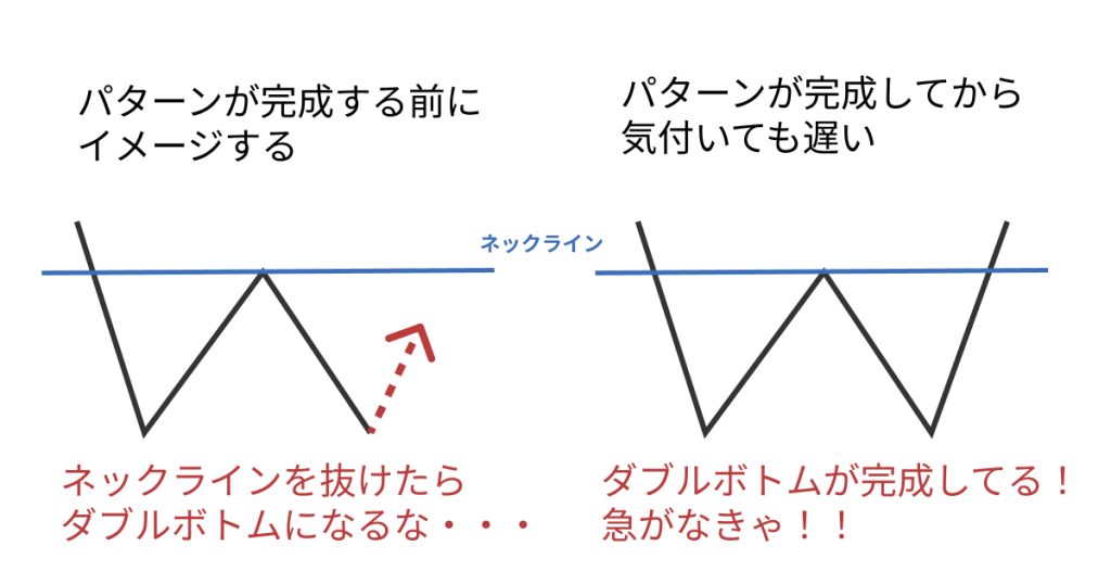 たとえば、ダブルボトムをうまく認識できない人が、ダブルボトムを使った手法を検証してもサインを見逃してしまったり、誤ったところでエントリーしてしまいそうですよね。
