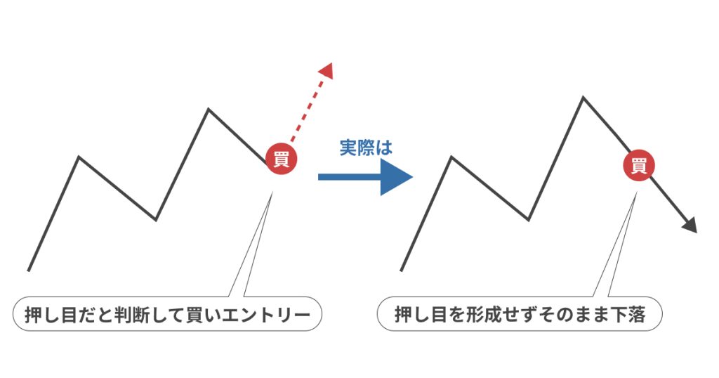 この場合、チャート分析力が未熟だと押し目と認識していても実は押し目ではなくそのまま下落することが頻繁に起こってしまいます。